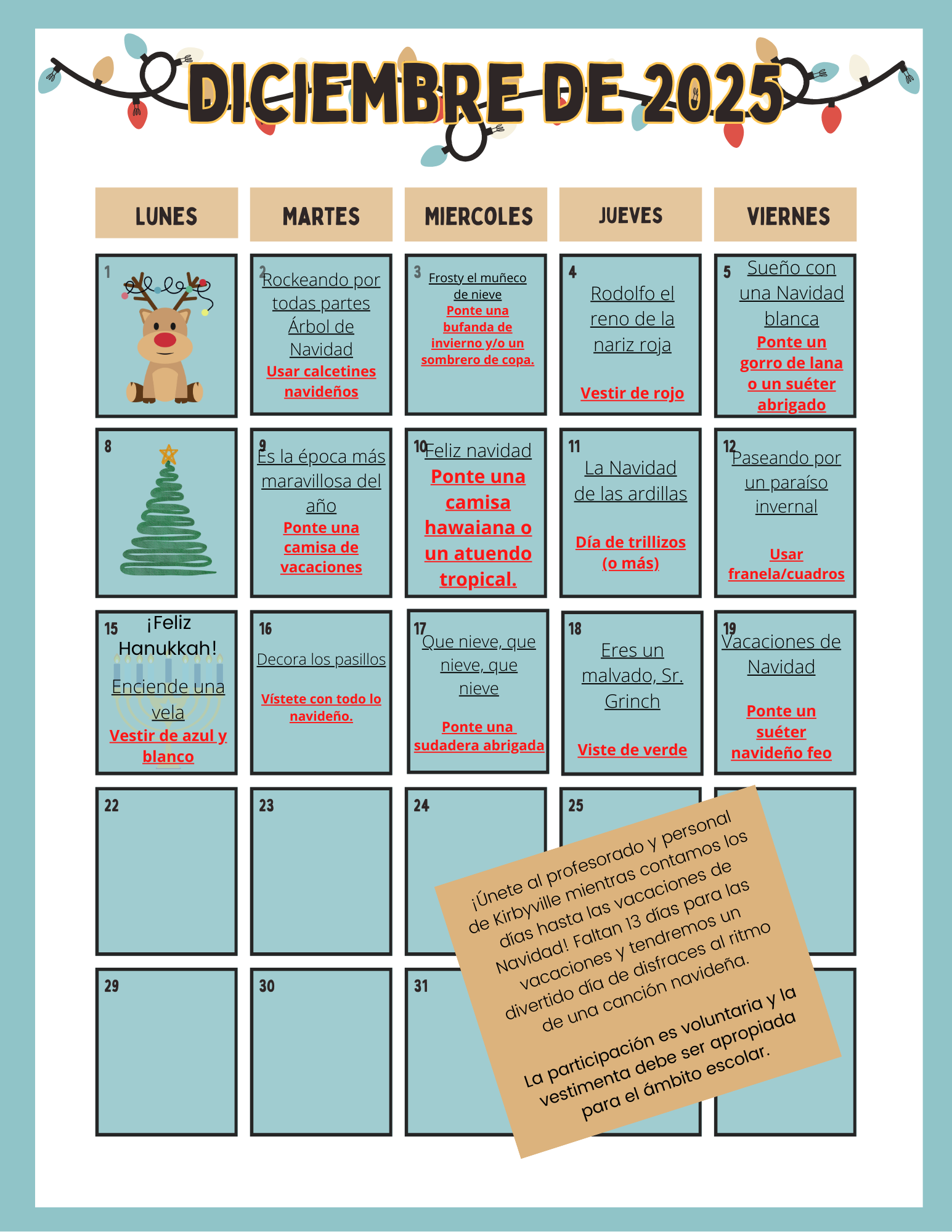 Kirbyville Schools will once again be counting down the days until Christmas vacation with our 13 Days of Christmas Countdown. Please see the calendar below to view the daily Christmas carol theme and accompanying dress up day. All dress up days must be school appropriate and fit the handbook guidelines.
